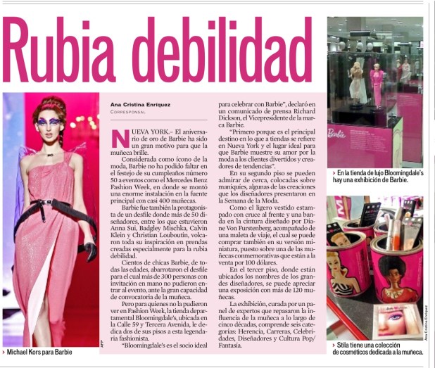 Cobertura de la celebración de los 50 años de Barbie en Nueva York para Grupo Reforma (México).