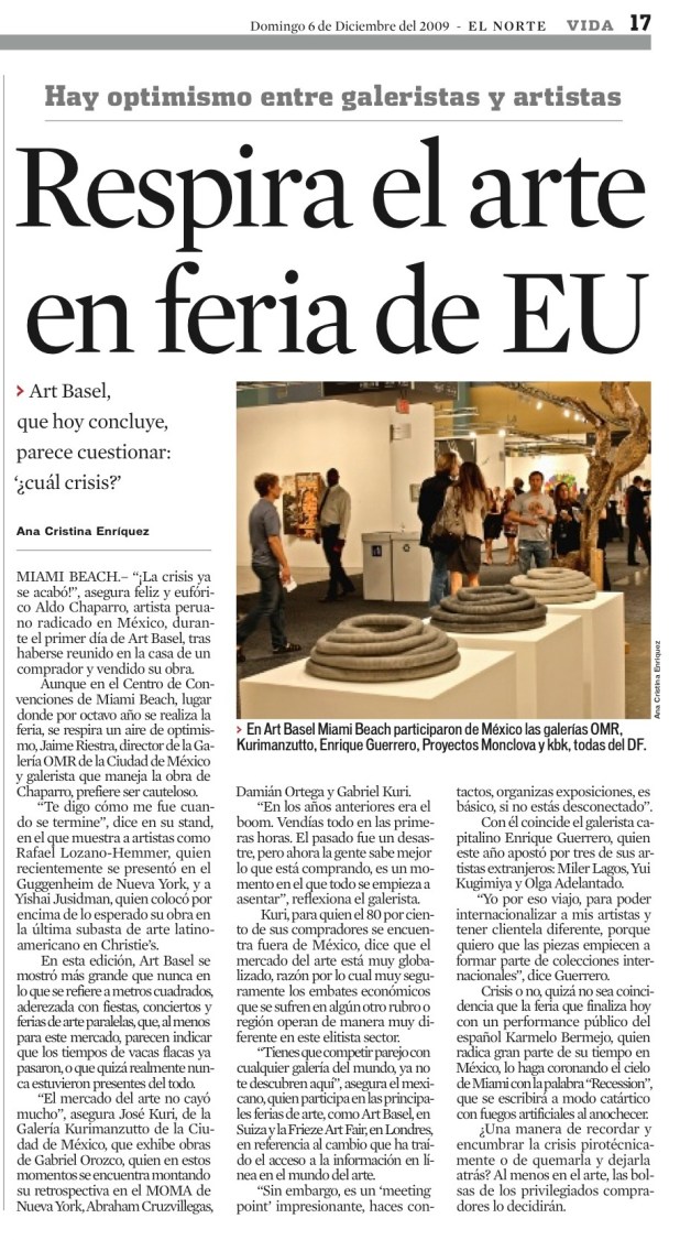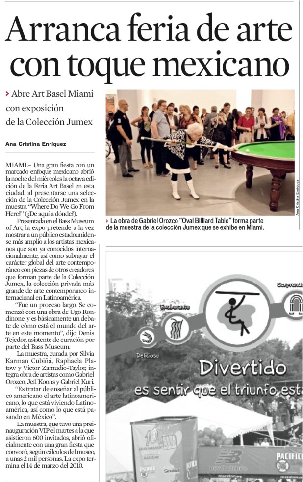 Cobertura, fotos y texto, de la feria de arte contemporáneo Art Basel que se realiza en Miami, publicada en el Periódico El Norte del Grupo Reforma, México.