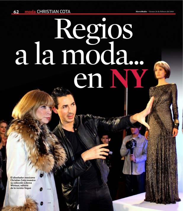 Ante tal situación tomé la decisión de tomar el ángulo social y enfocarme en la gente que estaba reunida en el evento, sabiendo que con buenas fotografías de los asistentes podría acomodar mi nota en uno de los suplementos sociales. Y efectivamente, fue el suplemento Sierra Madre, de El Norte, el que decidió llevar la nota, en la cual incluyeron mi foto de Christian con la editora de Vogue, Anna Wintour, en el momento en el que ésta llegó a ver su colección.
