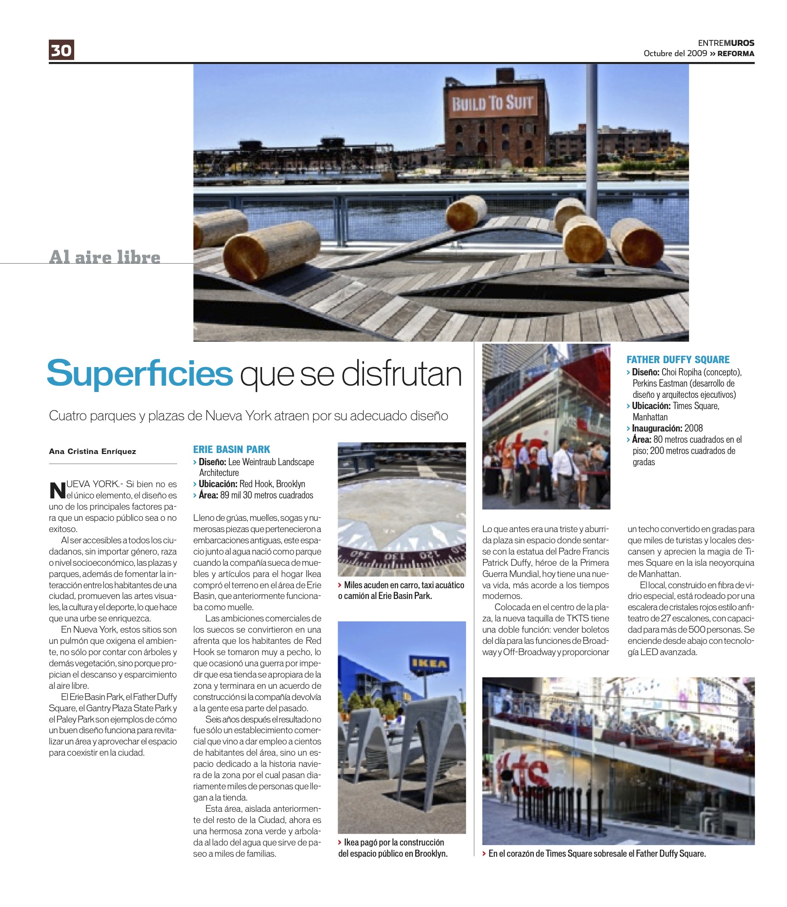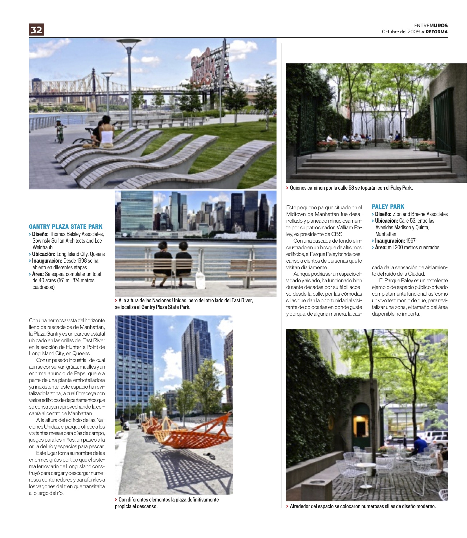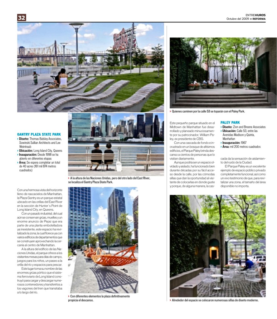 Uno de mis temas favoritos durante el tiempo que colaboré con Grupo Reforma era el relacionado a la arquitectura y el urbanismo. Este tema fue una idea propuesta por mí para mostrar a los lectores de Entre Muros los hermosos y funcionales espacios públicos que tiene la Ciudad de Nueva York.