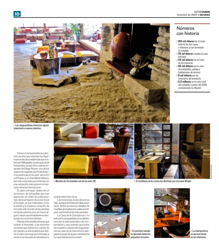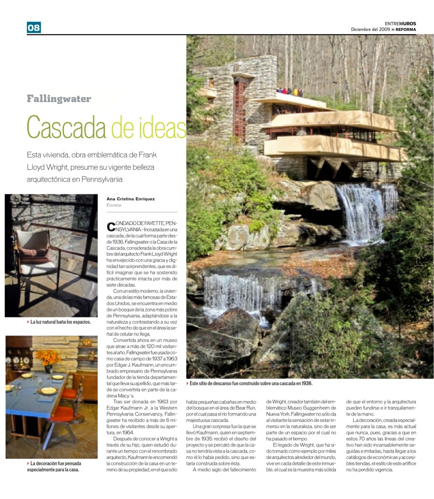 Éste fue un viaje personal que hice a la famosa Casa de la Cascada (Fallingwater) del arquitecto estadounidense Frank Lloyd Wright. En realidad no esperaba escribir nada al respecto, por lo que no me fui preparada con mi cámara profesional. Sin embargo, creo que las fotos tomadas con la PowerShot funcionaron a la hora de este reportaje que sali publicado en la sección Entre Muros del Grupo Reforma.